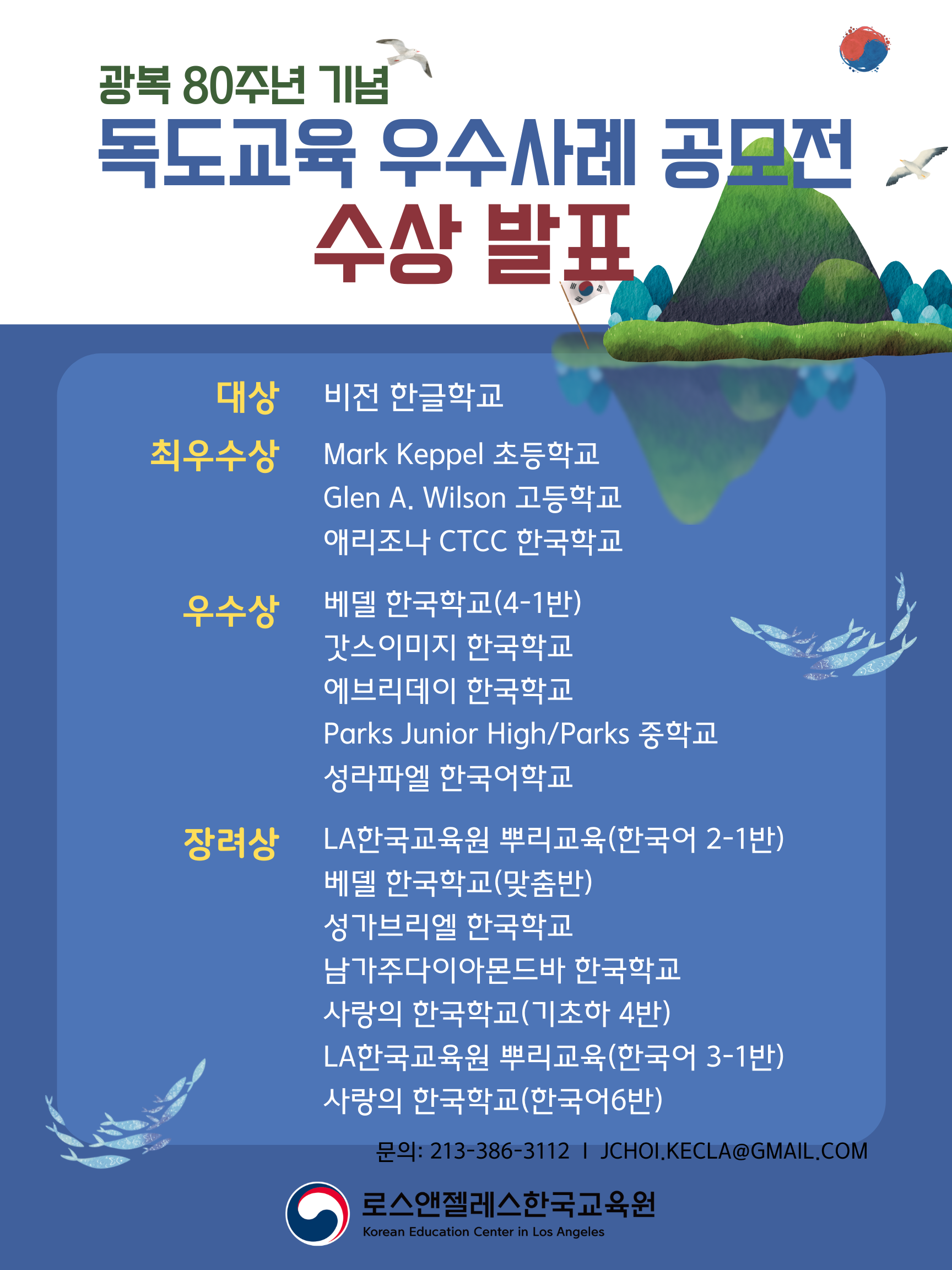 "광복 80주년 기념 독도 교육 우수사례 공모전" 수상 발표 공지사항 2025년11월07일 "광복 80주년 기념 독도 교육 우수사례 공모전"에 보내주신 성원에 깊은 감사를 드립니다. 수상 명단을 다음과 같이 알려드리며, 축하의 말씀을 전합니다.시상식은 11월 25일 (화) 오후 4:30-5:00 온라인 진행 예정이며,해당 학교(반)에 추후 상세 안내 드리겠습니다. 감사합니다. 공지사항 목록