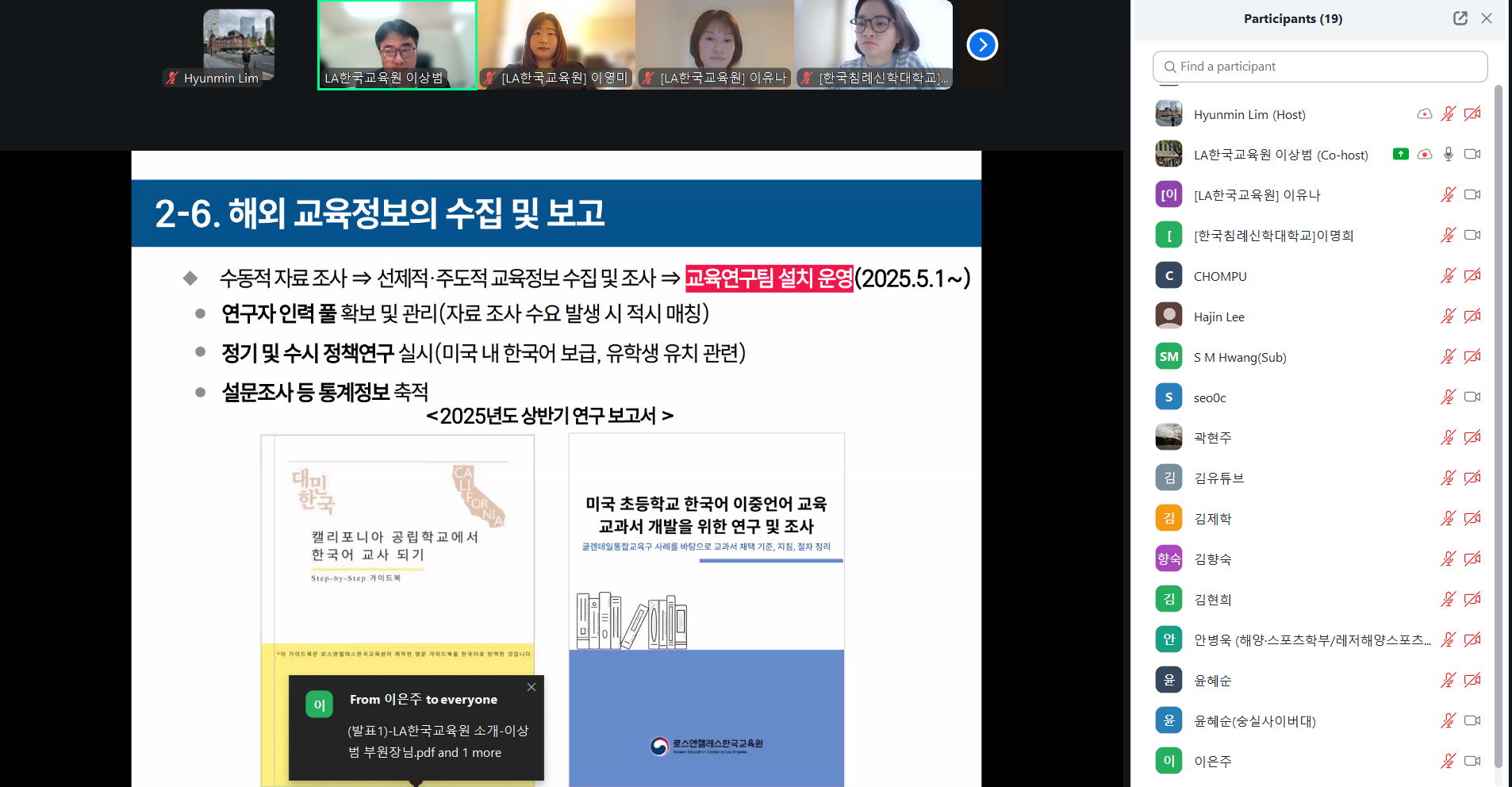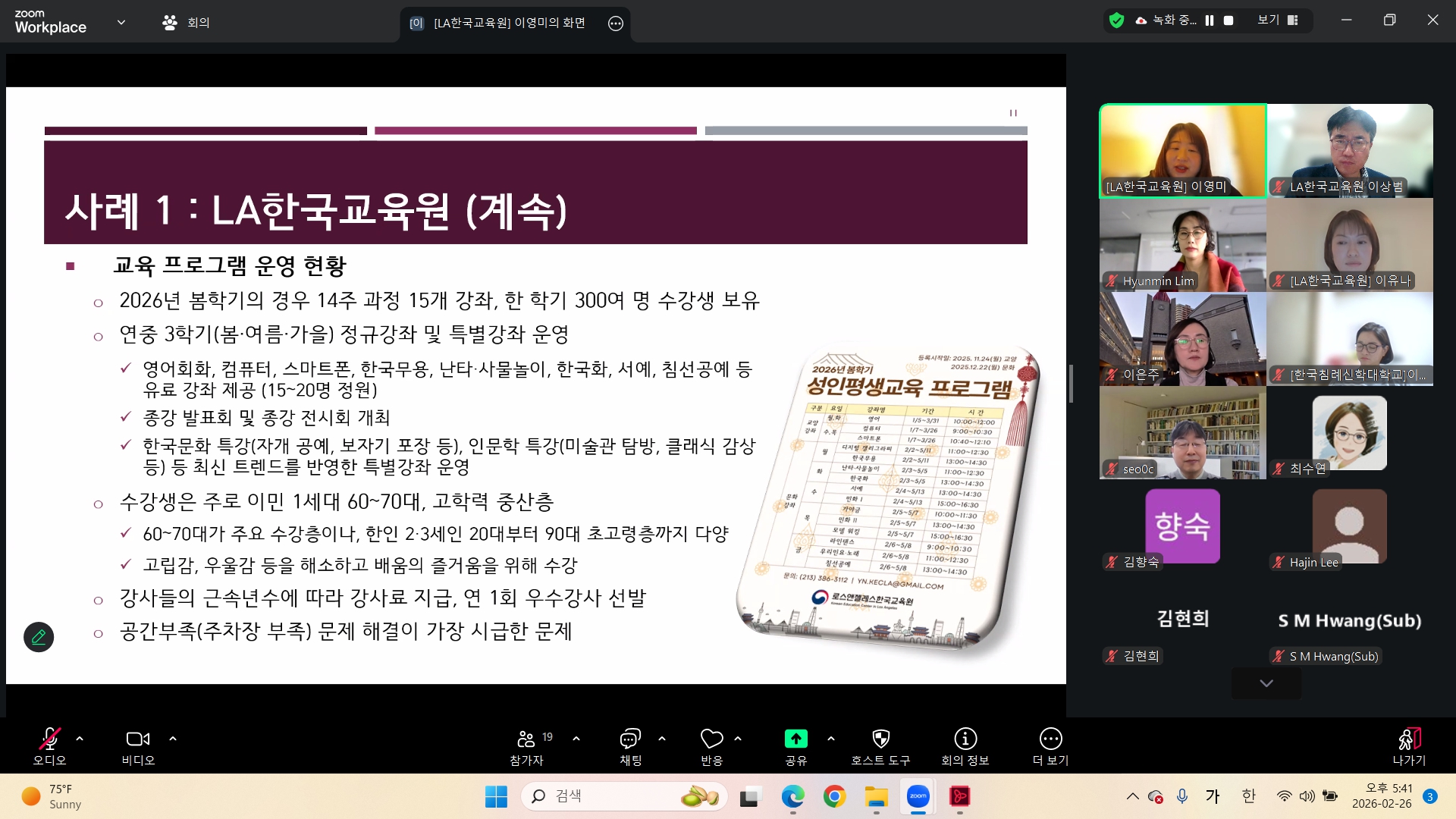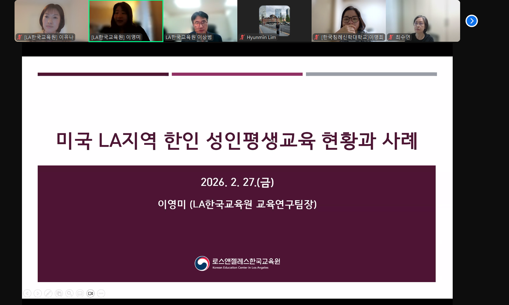 LA한국교육원, 한국노년교육학회 학술포럼 참가 및 발표 사진·영상뉴스 2026년02월27일 (발표1) 이상범 부원장: LA한국교육원 소개(발표2) 이영미 교육연구팀장: 미국 LA지역 한인 성인평생교육 현황과 사례(질의답변) 이유나 코디네이터 사진·영상뉴스 목록