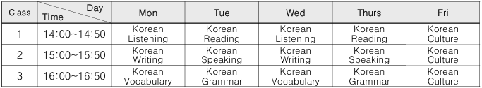 ※ Onebeginner-level Koreanclasswill beoffered, StudentsholdingTOPIKLevel 2–6 will attend4hoursofmorningclasses instead.