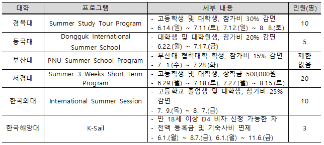 - 총 6개 한국대학 여름방학 단기 과정에 미국 시민권 학생 약 50명 초청