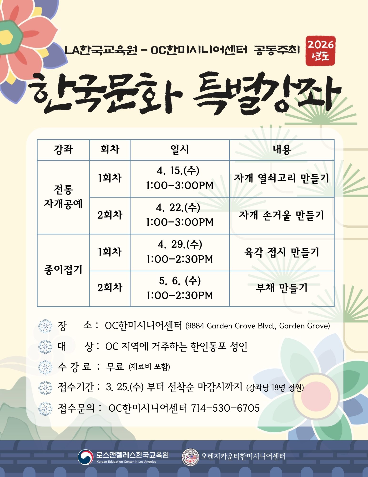 □ 수강생 모집은 3월 25일(수)부터 OC한미시니어센터에서 전화 (714-530-6705) 및 방문 접수를 통해 선착순으로 진행되며, OC 지역에 거주하는 한인 성인이라면 누구나 참여할 수 있습니다.