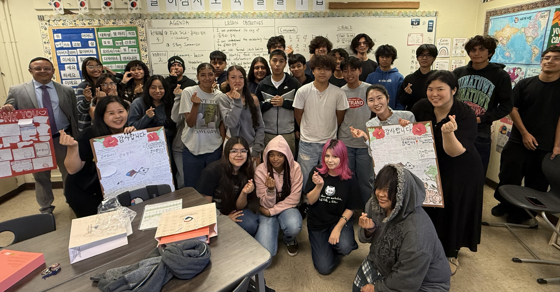 □ LA한국교육원(원장 강전훈)은 2025년 10월 16일(수) John Marshall 고등학교(교장 Juan Puentes) 한국어반 지원을 위한 양해각서(MOU)를 체결하고, 지원금을 전달하였습니다. 이 자리에는 한국어반 학생들과 교직원도 함께 참여하여 한국어 교육의 성장을 축하하고 한국문화를 공유하는 뜻깊은 시간을 가졌습니다.